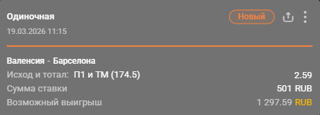 💡 Победа «Валенсии» + тотал меньше (176.5) за 2.38