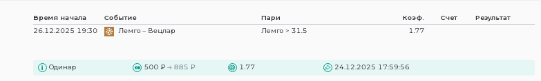 Индивидуальный тотал 1 Больше (31.5)Ставка: 100Проигрыш: -100