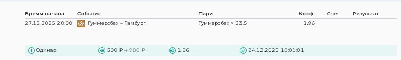 Индивидуальный тотал 1 Больше (32.5)Ставка: 100Выигрыш: +65 Результат: 33:27 (15:14 18:13)