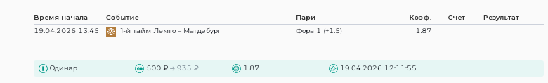 Фора 1 (3.5). 1-й ТаймСтавка: 100Выигрыш: +31 ROI 10 -69.73%