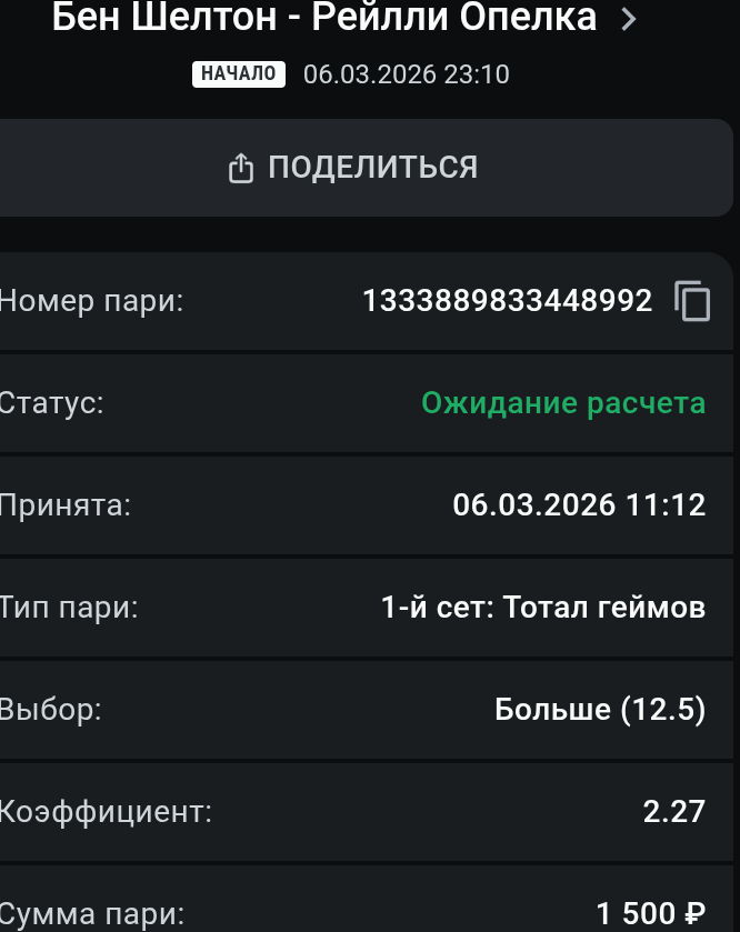 Большой привет всем любителям тенниса. Во втором круге калифорнийского мастерса сойдутся товарищи, которые в особом представлении не нуждаются. Что Бен, что Рейлли являются элитарными "подаванами". Опелка, во всяком случае, уж точно. Но и Шелтон, который заходит в данный поединок в статусе явного фаворита, способен выдавать хорошие серии с тузами.
