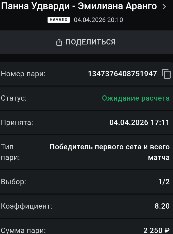 Думаю, если за счёт этой активности первый сет всё же отойдет к Удварди, но волевая победа девочки в кепочке вполне может состояться. Кстати, предыдущая встреча на грунте турнира в Санта-Крузе завершилась как раз разворотом в Аранго. А сегодня и местная толпа будет целиком и полностью на её стороне, создавая давление на будущую онлифанщицу.
