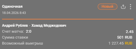 В полуфинале 15-й ракетке мира предстоит сыграть с Хамадом Медьедовичем. Букмекеры ведут российского теннисиста фаворитом, но разброс в коэффициентах не слишком велик – на Андрея предлагают неплохие 1.65. В целом Хамад не должен стать большой проблемой для Рублева: серб играет в очень простой силовой теннис, но Андрей в тот же самый теннис играет дольше и на более высоком уровне.
